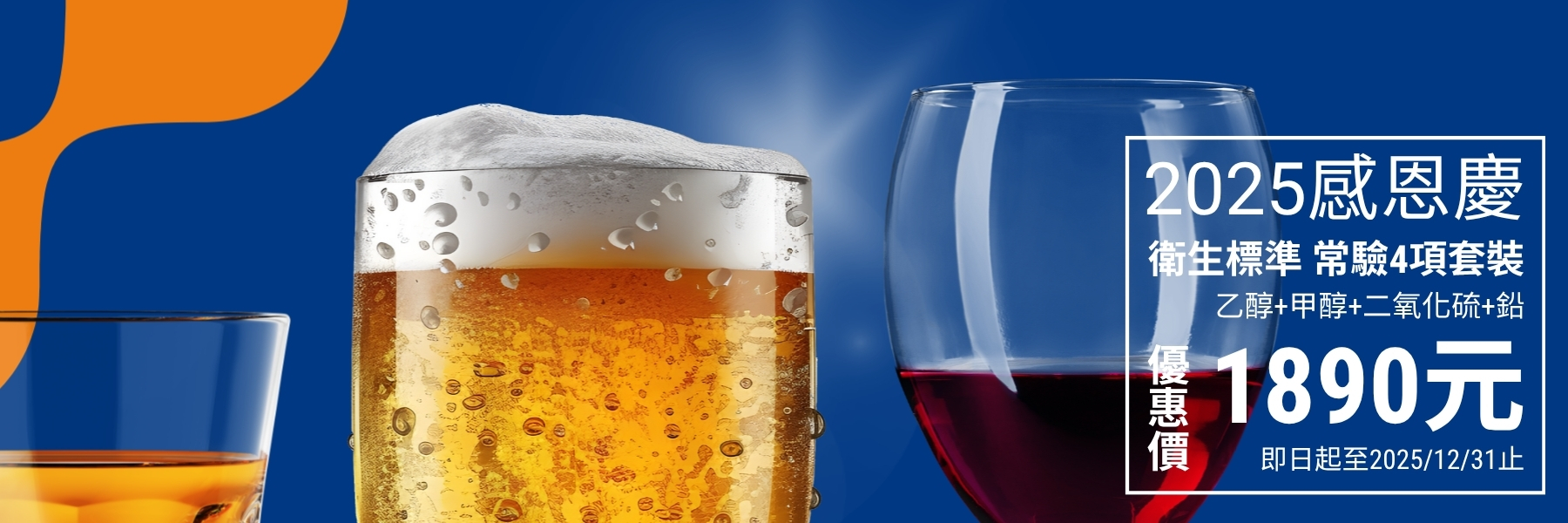 Eurofins歐陸食品檢驗2025感恩慶酒類檢驗優惠開跑囉,即日起至2025/12/31止,酒類衛生標準常驗4項套裝(乙醇+甲醇+二氧化硫+鉛)▸ 回饋感恩7折優惠!